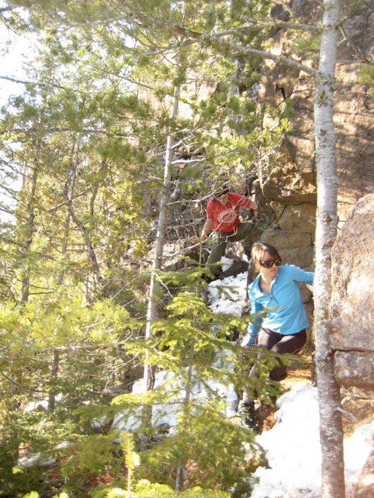 We took our time, carefully making it to the top of the rock ledge. When we got up there it was to our surprise that we found a little un-registered geo-cache hanging from a tree. We signed the log book and took some photos of ourselves with the camera in the box.